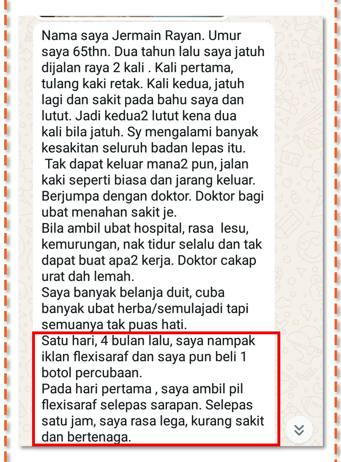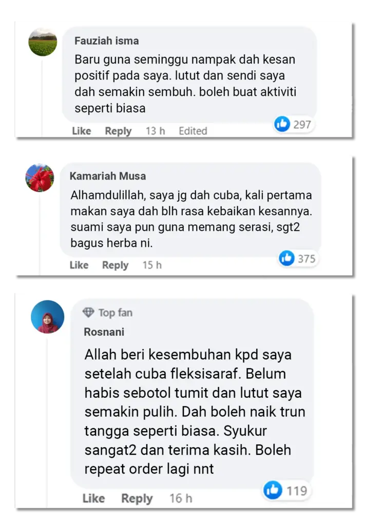 Testimonials found at https://brfleksisaraf.onlinemudah.com/ and/or from Herba Fleksisaraf are unverified results that have been forwarded to us by users of the product. The results may vary for each individual and are not intended to represent or guarantee that anyone will achieve the same or similar results within a specific period of time.