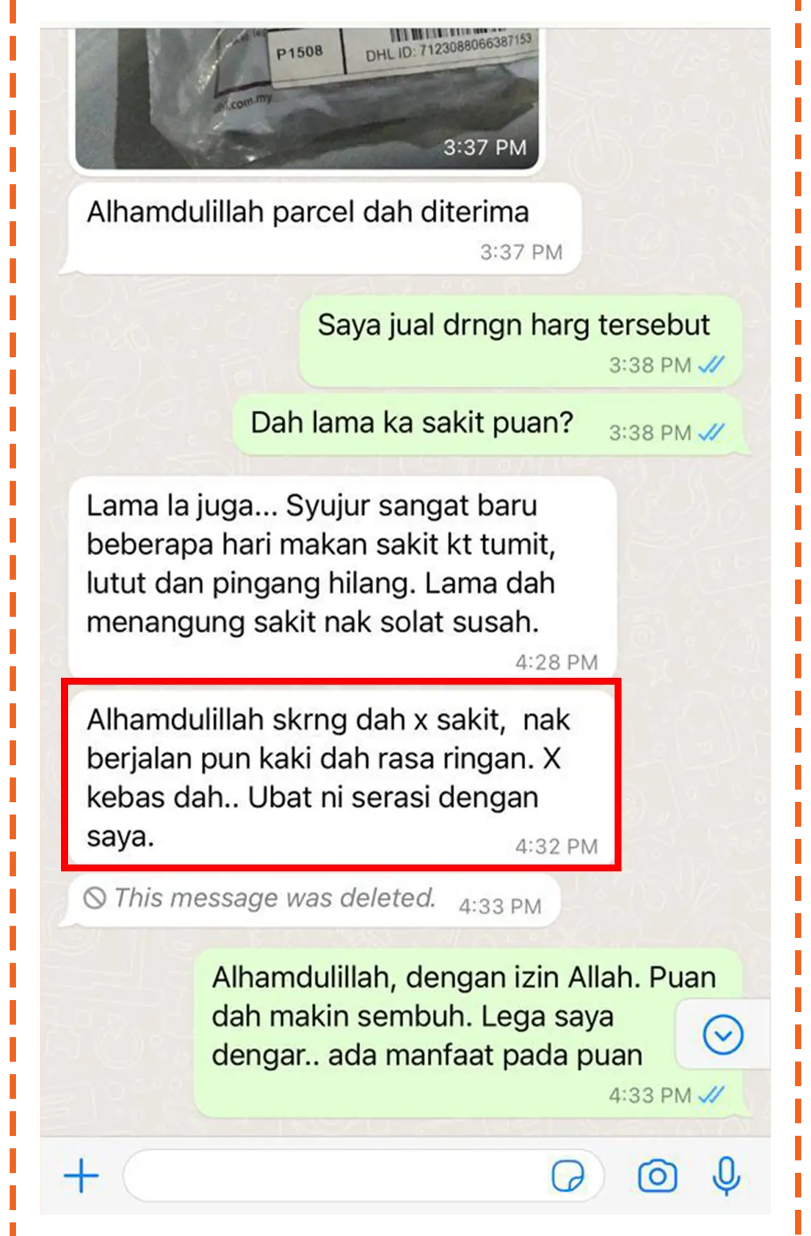 *PENAFIAN: Keberkesanan produk ini bergantung kepada kesesuaian individu. Setiap hasil dari penggunaan adalah berbeza bagi setiap individu. Produk ini akan memberi kesan terbaik sekiranya pengguna mengamalkan dengan cara betul berdasarkan banyak testimoni yang diperolehi. Kita berikhtiar, tuhan yang menyembuhkan.
