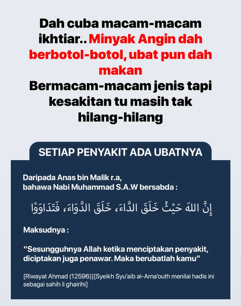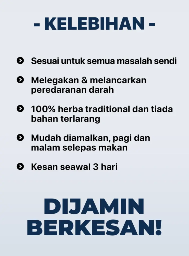 *PENAFIAN: Keberkesanan produk ini bergantung kepada kesesuaian individu. Setiap hasil dari penggunaan adalah berbeza bagi setiap individu. Produk ini akan memberi kesan terbaik sekiranya pengguna mengamalkan dengan cara betul berdasarkan banyak testimoni yang diperolehi. Kita berikhtiar, tuhan yang menyembuhkan.